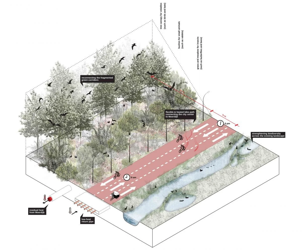 ‘Energetic bicycle routes’ are at the same time a planning concept and an infrastructure concept: by combining the trajectories for a thermal energy network, a fast bicycle path and an ecological connection, a robust and attractive infrastructure bundle is created. The cyclist enjoys a green and high-tech bike path, while the energy network is benefitting plants and animals as a landscape corridor. The result is an iconic new infrastructure typology for the region.