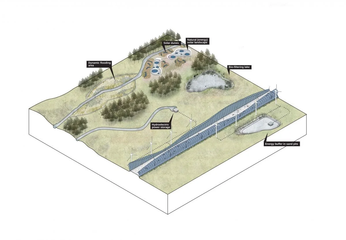 ‘Attractive energy landscapes’ incorporate several energy production and storage principles in a new interpretation of the Brabant landscape. By re-designing energy technology to appeal to the public, a new leisure landscape arises which can be made to adapt to climate change conditions as well.