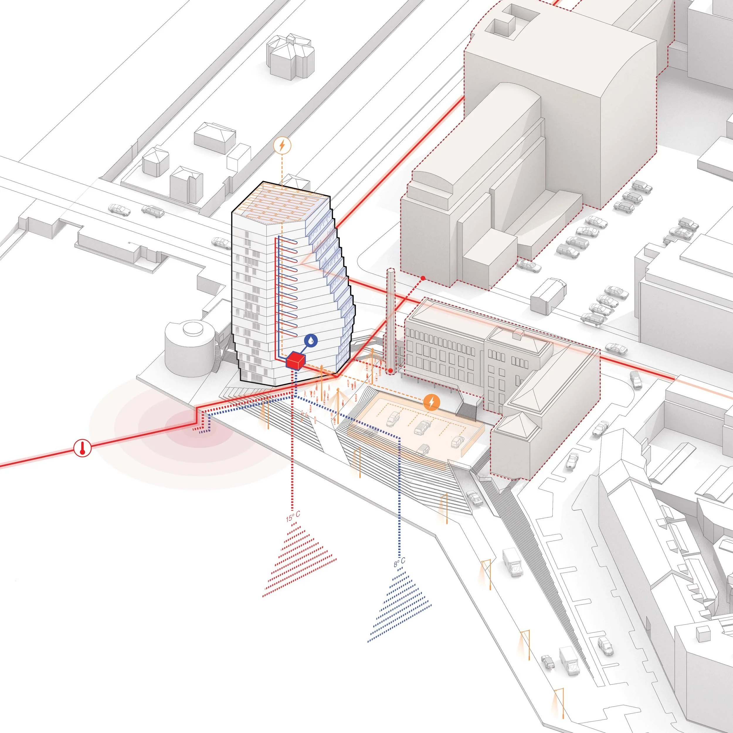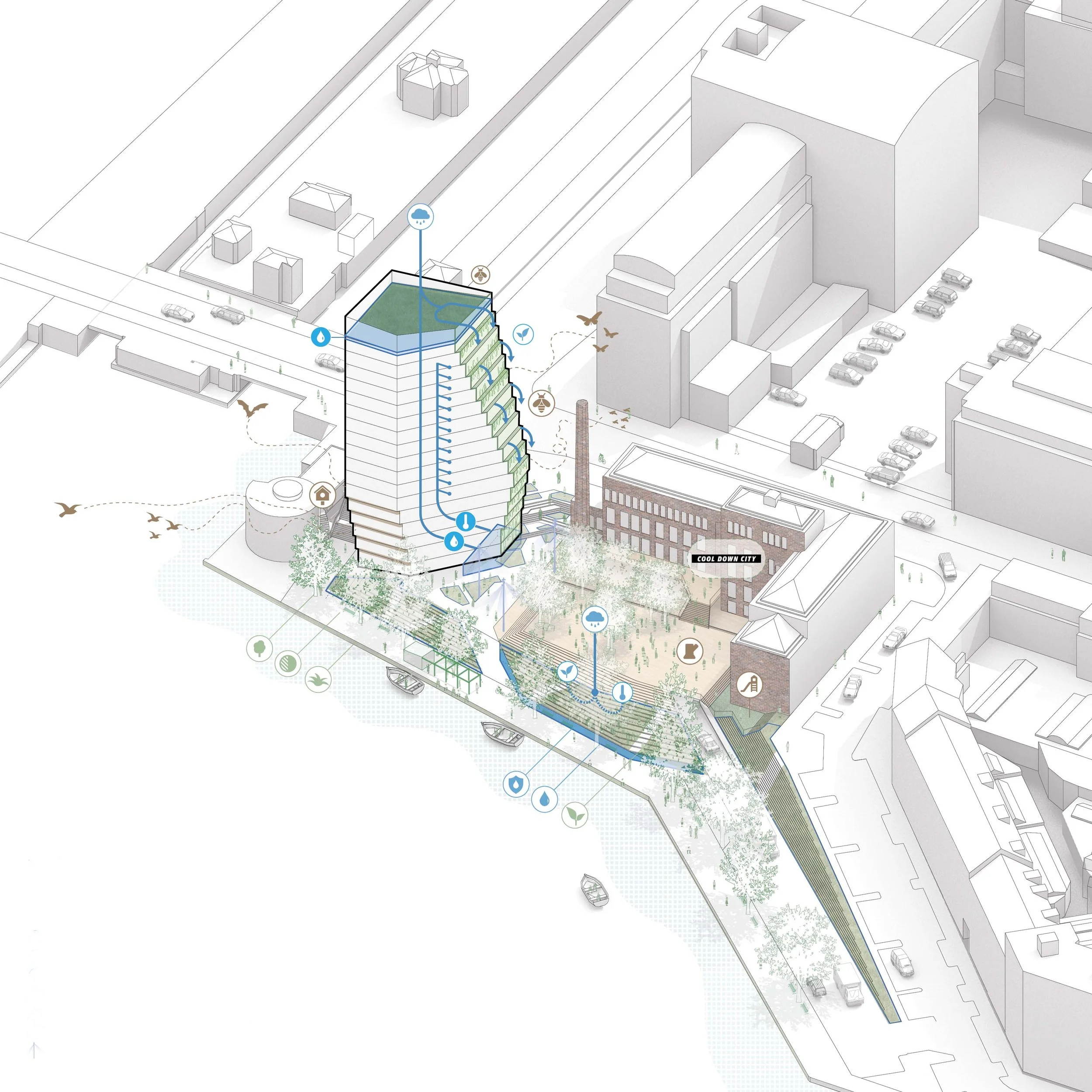 Through a combination of solar panels, heat exchange with the harbor water, and underground storage, The Sluiswachter stores its own energy. Collected rainwater cools the interiors and feeds the greenery that wraps around the façade. Inside, energy use is visible and easy to manage as residents can track their own consumption and learn from the building’s performance.