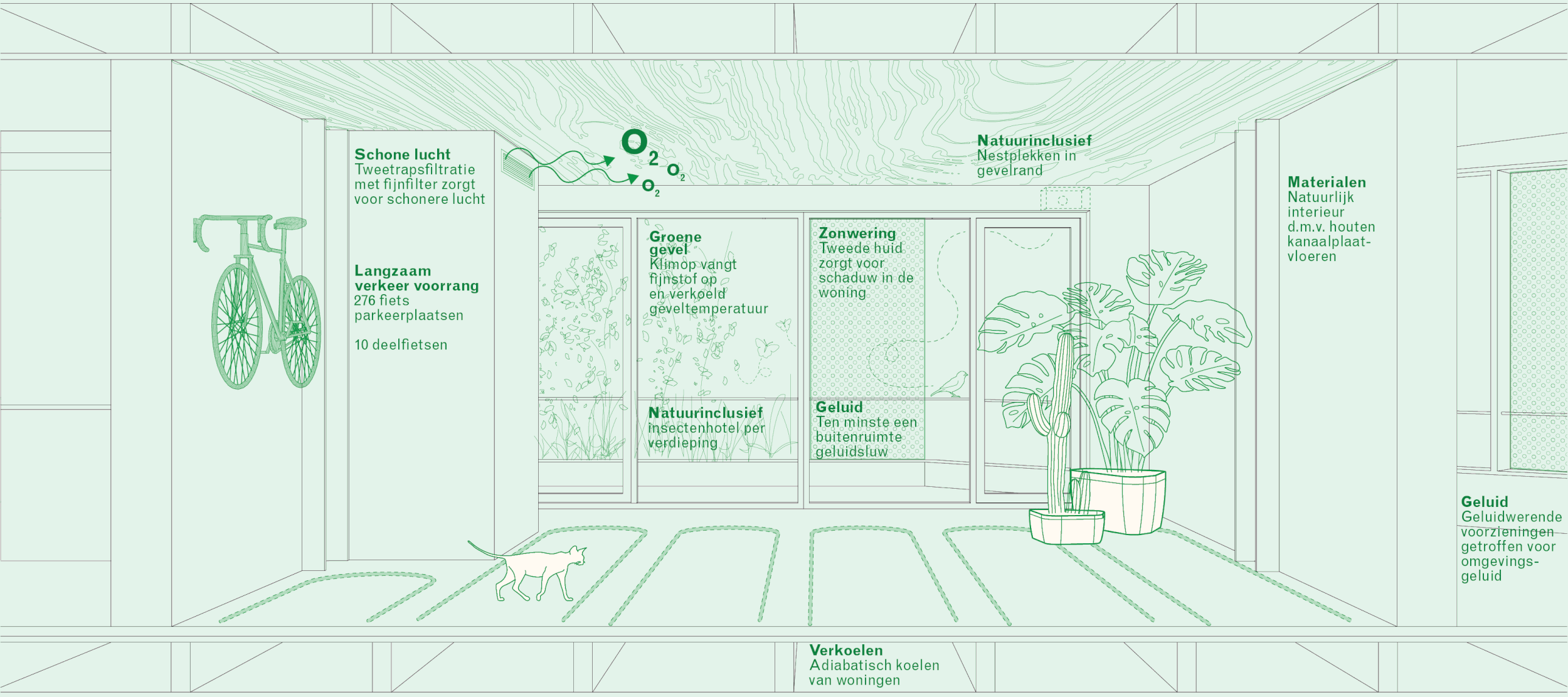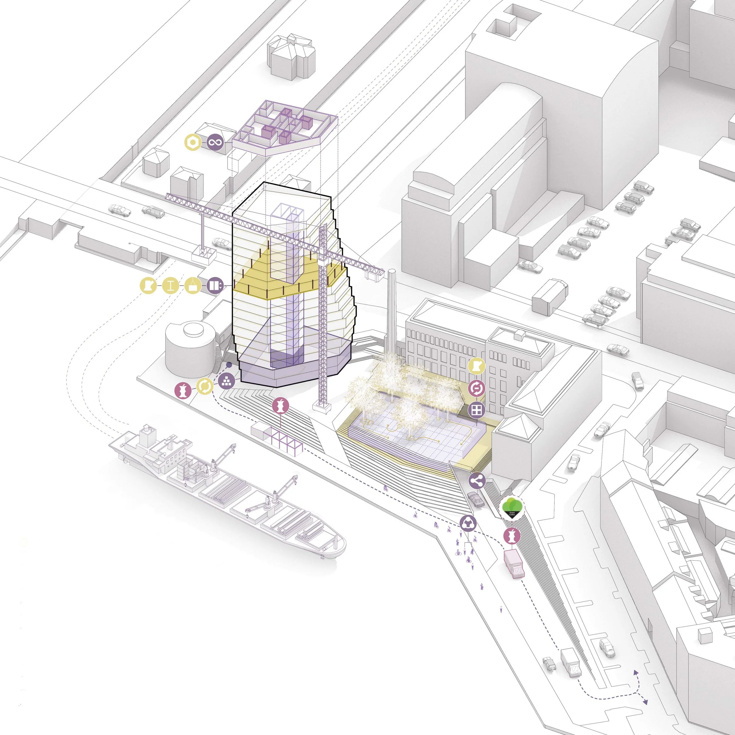 The residential tower embodies this ambition in both structure and interior, through a triple focus on energy, circularity and climate. Simultaneously, it constitutes a sustainable icon alongside existing monuments such as Puntegale, the Machinist and the Gemaal Parksluizen.